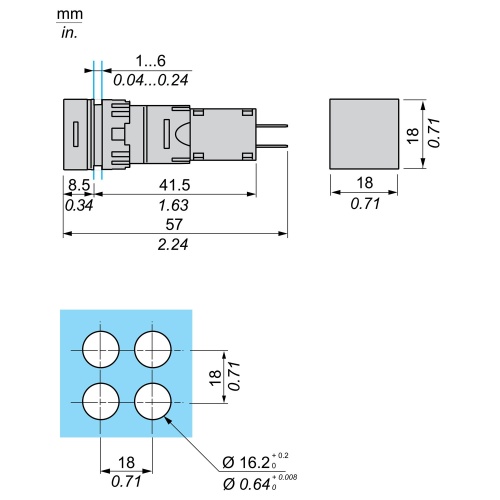 Schneider Electric XB6CV1BB Harmony 16 mm Square White Plastic Illuminated Pilot Light Modular Complete Assembly is made for small areas and is designed to be simple and flexible with a Faston Connector and a Steady signal. Uses 12-24 V AC/DC and is IP 65 and UL 508 rated.
