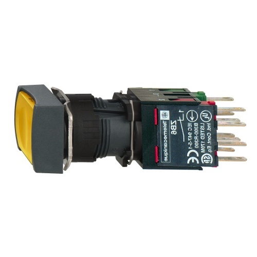 Schneider Electric XB6CW5B5B Harmony 16 mm Square Yellow Plastic Illuminated Push Button Modular Complete Assembly with a Flush profile is made for small areas and is designed to be simple and flexible. Has 1 NO + 1 NC contacts with Spring return functionality. uses 12-24 V AC/DC and is IP 65 and UL 508 rated.