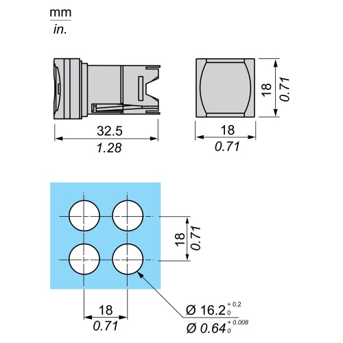 Schneider Electric ZB6CW3 Harmony 16 mm Square Green Plastic Illuminated Push Button Modular Head with a Flush profile is made for small areas and is designed to be simple and flexible. Has Spring return functionality. This product is IP 65 and UL 508 rated.