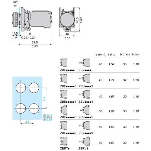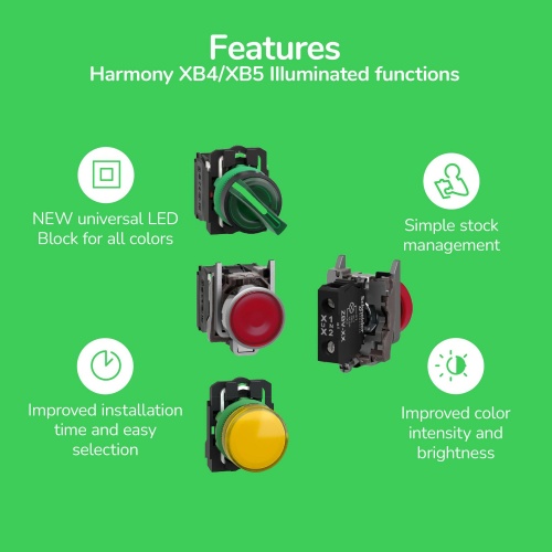 Schneider Electric XB4BV5B6 Harmony 22 mm Round Blue Chromium plated metal Illuminated Pilot Light Modular Complete Assembly is made of high quality materials and is designed to be simple and flexible. Uses 400 V AC and is IP 69 and UL 508 rated.