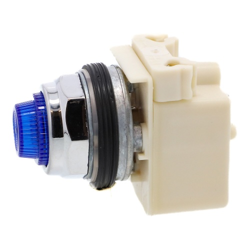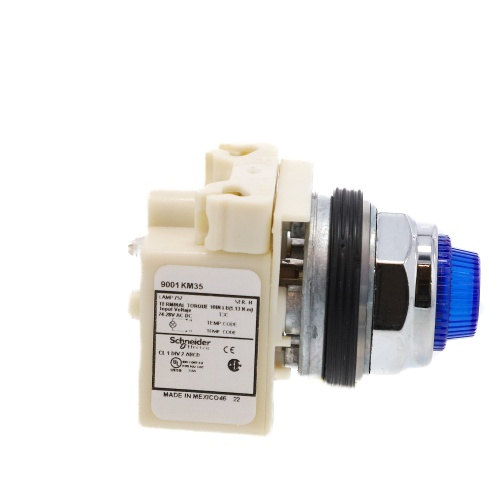 Schneider Electric 9001KP35L31 Harmony 30 mm Blue Chromium plated metal Illuminated Pilot Light Modular Complete Assembly is made of high quality materials and is designed to be simple and flexible with Screw Clamp Terminals. Uses 24-28 V AC/DC and is .