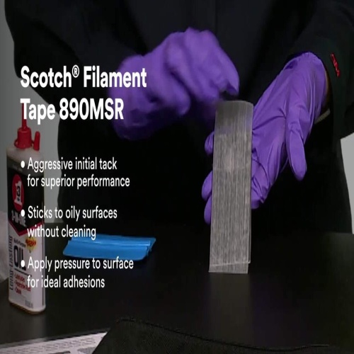 3M 7000124630 - Industrial-strength, filament-reinforced tape resists nicks, abrasion and moisture. Modified synthetic rubber adhesive provides better adhesion than natural rubber adhesives and bonds well to metals and oily surfaces. Glass yarn filaments add strength for pipe wrapping applications. Application: Metal Coil Closure - Cat. No. 890MSR