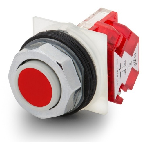 This Harmony 9001K, modular projecting red push button has 2 positions, operates with spring return mechanism