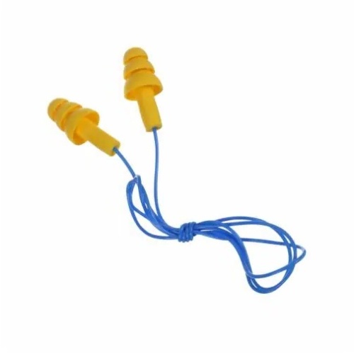 3M 7000127255 is a corded earplug made of elastomeric polymer material that provides hearing protection with an attenuation rating of 25.0 decibel. The multi-flange shape and regular size ensure a comfortable fit. It is moisture resistant, electrically insulated, and reusable, making it suitable for various environments. The yellow colored earplugs come in a package of 5 pairs with blue vinyl cords. The earplugs do not require roll-down insertion and are not metal detectable. The 3M 7000127255 is an efficient and practical choice for ear protection.