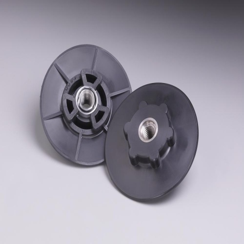 3M 7000144106 Back-up Pad is a black, mechanical attachment with a disc pad hub for use with disc sanders and right angle grinders. It is suitable for deburring, finishing, polishing, and surface preparation in industries such as metalworking, metal fabrication, and plumbing fixtures. The retainer nut has a thread size of 3/8-24 INT x 5/8-11 EXT.