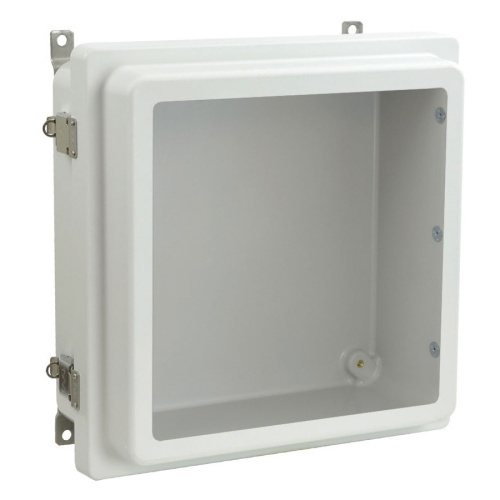 Allied Moulded AM1224RLW AM-R Series JIC Size Fiberglass Enclosure with Windows 12.00" x 12.00" x 5.75" (HxWxD) Approx. Inside Dimensions Raised Stainless Steel Lockable Snap Latch Hinged Cover.