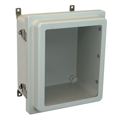 Allied Moulded AM1648RLW AM-R Series JIC Size Fiberglass Enclosure with Windows 16.00" x 14.00" x 9.75" (HxWxD) Approx. Inside Dimensions Raised Stainless Steel Lockable Snap Latch Hinged Cover.