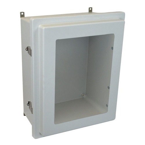 Allied Moulded AM2068RLW AM-R Series JIC Size Fiberglass Enclosure with Windows 20.00" x 16.00" x 9.75" (HxWxD) Approx. Inside Dimensions Raised Stainless Steel Lockable Snap Latch Hinged Cover.