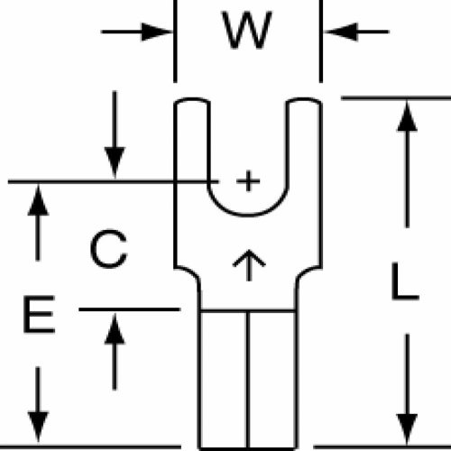 Scotchlok™ Fork Terminals (M10-10FBX) are non-insulated, block-style terminals. They have an overall length of 0.73 inches, a maximum conductor size of 10 AWG (imperial) or 5.26 mm² (metric), and a minimum conductor size of 12 AWG (imperial) or 3.31 mm² (metric). These terminals have a barrel style of brazed and a fork type of block. The stud size is #10, with a stud diameter of 0.19 inches (imperial) or 4.826 mm (metric). The overall width is 0.32 inches, and the terminal style is a block. UL file number E23438 and CSA file number LR22190 are associated with this product. The barrel inside diameter is 0.135 inches, and the dimension E is 0.54 inches. The clearance (C) is 0.29 inches. - 7010399939