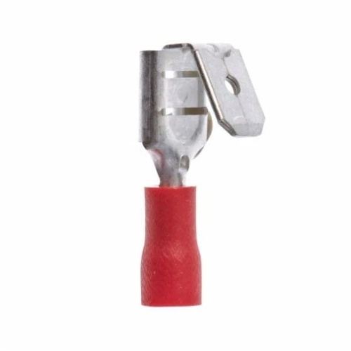 Quick Disconnect product, with part number MVU18-250DMFX-A, is a Scotchlok™ brand offering. It has an overall length of 0.87 inches and can accommodate a maximum conductor size of 18 AWG or 1 mm². The minimum conductor size it can handle is 22 AWG or 0.34 mm². This vinyl-insulated disconnect terminal is suitable for wireless network infrastructure accessories. The barrel style is butted, with a connection width of 0.25 inches or 6.35 mm. It is designed with a piggy-back terminal style and has a barrel inside diameter of 0.070 inches. The barrel length is 0.23 inches, and the maximum insulation outer diameter is 0.15 inches. The disconnect type is Female-Male, and the fastener orientation is Male-Female. The tab width is 0.25 inches, and it mates with male and female tabs of the same width (0.250 inches). - 7100165280