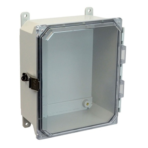 Allied Moulded AMU864CCL ULTRALINE AMU Series JIC Size Fiberglass Enclosure with Clear Covers 8" x 6" x 4" (HxWxD) Approx. Inside Dimensions Metal Snap Latch Hinged Cover.