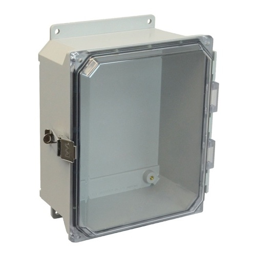 Allied Moulded AMU864CCLF ULTRALINE AMU Series JIC Size Fiberglass Enclosure with Clear Covers 8" x 6" x 4" (HxWxD) Approx. Inside Dimensions Metal Snap Latch Hinged Cover.