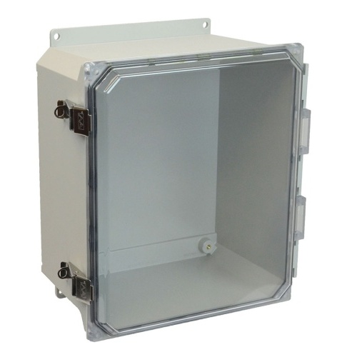 Allied Moulded AMU1206CCLF ULTRALINE AMU Series JIC Size Fiberglass Enclosure with Clear Covers 12" x 10" x 6" (HxWxD) Approx. Inside Dimensions Metal Snap Latch Hinged Cover.