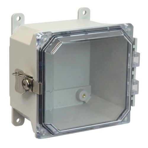 Allied Moulded AMU664CCT ULTRALINE AMU Series JIC Size Fiberglass Enclosure with Clear Covers 6" x 6" x 4" (HxWxD) Approx. Inside Dimensions Lockable Twist Latch Hinged Cover.