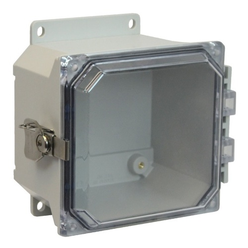Allied Moulded AMU664CCTF ULTRALINE AMU Series JIC Size Fiberglass Enclosure with Clear Covers 6" x 6" x 4" (HxWxD) Approx. Inside Dimensions Lockable Twist Latch Hinged Cover.