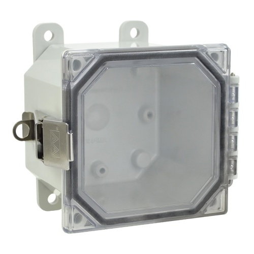 Allied Moulded AMP443CCL POLYLINE AMP Series JIC Size Polycarbonate Enclosure with Clear Covers 4" x 4" x 3" (HxWxD) Approx. Inside Dimensions Stainless Steel Lockable Snap Latch Hinged Cover.
