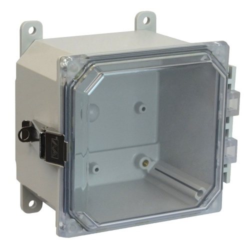 Allied Moulded AMP664CCL POLYLINE AMP Series JIC Size Polycarbonate Enclosure with Clear Covers 6" x 6" x 4" (HxWxD) Approx. Inside Dimensions Stainless Steel Lockable Snap Latch Hinged Cover.