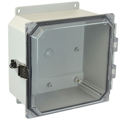 Allied Moulded AMP884CCLF POLYLINE AMP Series JIC Size Polycarbonate Enclosure with Clear Covers 8" x 8" x 4" (HxWxD) Approx. Inside Dimensions Stainless Steel Lockable Snap Latch Hinged Cover.