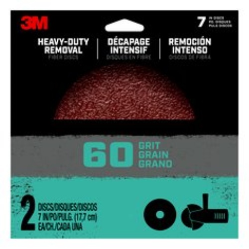The 3M Fiber Disc with grit size 60 (#70009104657) is a high-performance abrasive product suitable for various applications. It weighs 3.41 pounds and is packed in a case that contains 12 packs. This particular disc is classified as FBRDISC7IN60 under the 3M catalog.