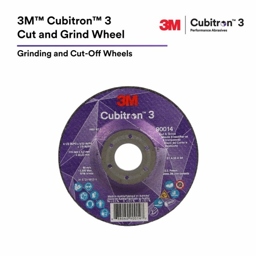 The 3M Cubitron™ 3 Cut and Grind Wheel is a versatile tool that can be used for grinding, cutting, gouging, and more. Unlike other abrasive products, it has a flat, reinforced inner surface for shaping and grinding, and a thin outer edge for making perpendicular cuts and gouges. This eliminates the need for multiple abrasive tools and helps maximize production. It is powered by 3M Re-Engineered Precision Shaped Grain, which creates clean, sharp points for faster, cooler, and longer-lasting cutting. Choose the 3M Cubitron™ 3 Cut and Grind Wheel for the next generation in abrasive performance.
