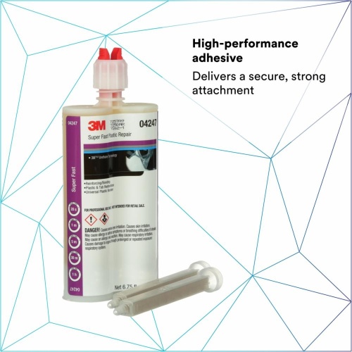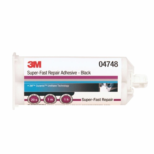 The 3M Super-Fast Repair Adhesive (SKU 04248) is a black, two-part urethane adhesive in a 200 mL cartridge. It has a work time of 20 seconds, a full cure time of 1 hour, and a sand time of 5 minutes. With a container size of 6.76 fl oz (US), it is ideal for plastic repair applications.