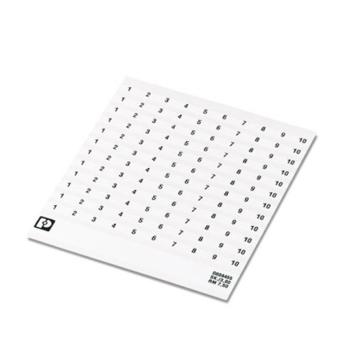 Phoenix Contact 0804455:0001 The markers come in the form of self-adhesive cards labeled from 1 to 10, arranged into 10 sections with each section representing a decade, and are available in white with a terminal block width of 7.5mm that can be mounted using an adhesive method.