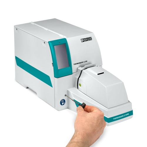 Phoenix Contact 1287046 A equipment set is comprised of an E.WIRE applicator and a THERMOMARK E.300 BASIC printing system, designed to print and apply movable E-WM markers to wires and cables.