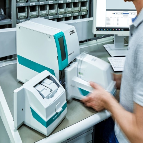 Phoenix Contact 1203216 A device designed to streamline the printing and application of electronic marking markers onto wires and cables within a seamless one-step production process.