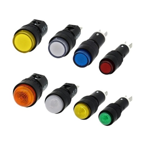 8mm, 10mm, 12mm, and 16mm round panel cutouts, Super bright LEDs, Built-in current-limiting resistor and reverse polarity protection diode, Dome or flat lenses, IP65, UL Recognized, CSA Certified