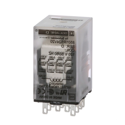 Schneider Electric 8501RS24V20 R type plug in relay 1 Amp Four Pole 120 VAC coil No Indicator. This relay is made for logic elements and power switching devices. The armature of the relay is designed with a short stroke motion to allow for a long mechanical life of high speed operation. Is rated for 0.167 hp @ 120 VAC motor load.