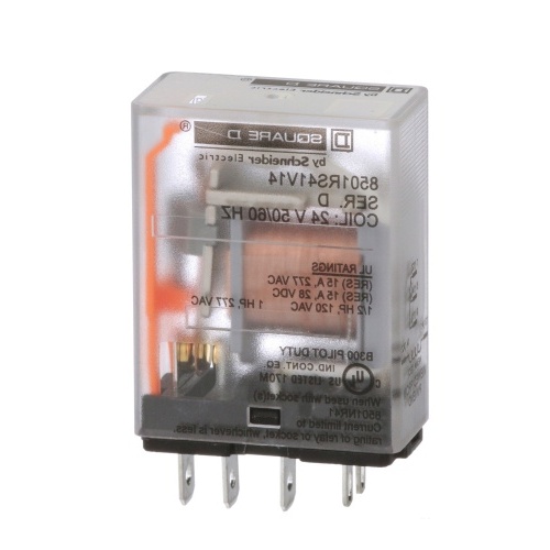 Schneider Electric 8501RS41V14 R type plug in relay 12 Amp Single Pole 24 VAC coil No Indicator. This relay is made for logic elements and power switching devices. The armature of the relay is designed with a short stroke motion to allow for a long mechanical life of high speed operation. Is rated for 0.5 hp @ 120 VAC 1 hp @ 277 VAC motor load.