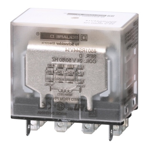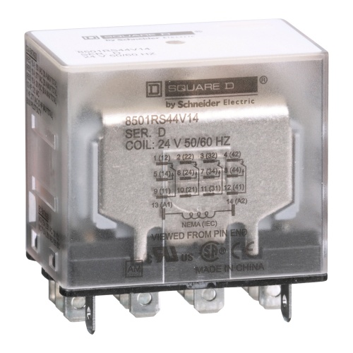 Schneider Electric 8501RS44V14 R type plug in relay 10 Amp Four Pole 24 VAC coil No Indicator. This relay is made for logic elements and power switching devices. The armature of the relay is designed with a short stroke motion to allow for a long mechanical life of high speed operation. Is rated for 0.5 hp @ 120 VAC 1 hp @ 277 VAC motor load.