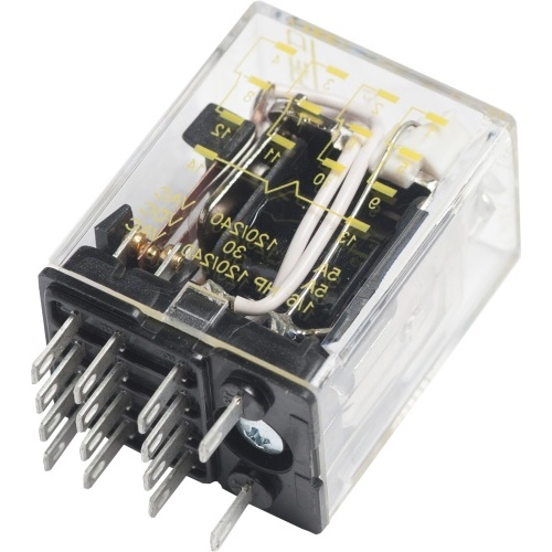 Schneider Electric 8501RSD14P14V53 R type plug in relay 5 Amp Four Pole 24 VDC coil LED Indicator. This relay is made for logic elements and power switching devices. The armature of the relay is designed with a short stroke motion to allow for a long mechanical life of high speed operation. Is rated for 0.33 hp @ 120 VAC 0.5 hp @ 277 VAC motor load.