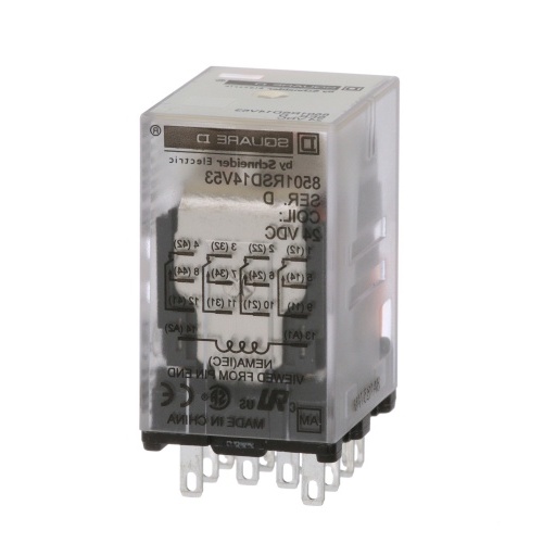 Schneider Electric 8501RSD14V53 R type plug in relay 5 Amp Four Pole 24 VDC coil No Indicator. This relay is made for logic elements and power switching devices. The armature of the relay is designed with a short stroke motion to allow for a long mechanical life of high speed operation. Is rated for 0.33 hp @ 120 VAC 0.5 hp @ 277 VAC motor load.