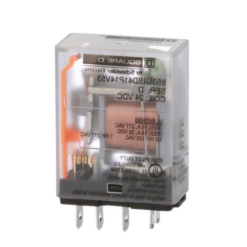 Schneider Electric 8501RSD41P14V53 R type plug in relay 12 Amp Single Pole 24 VDC coil LED Indicator. This relay is made for logic elements and power switching devices. The armature of the relay is designed with a short stroke motion to allow for a long mechanical life of high speed operation. Is rated for 0.5 hp @ 120 VAC 1 hp @ 277 VAC motor load.