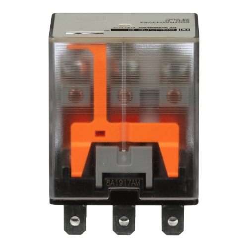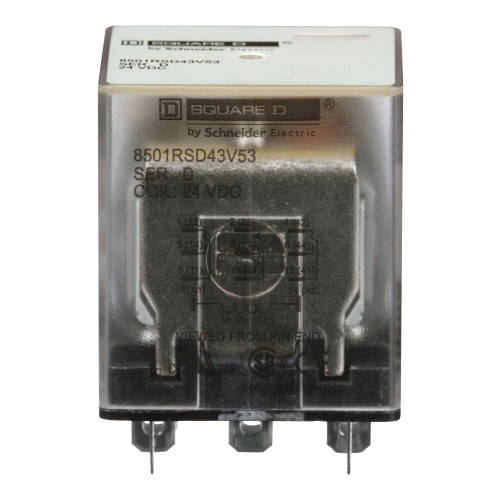 Schneider Electric 8501RSD43V53 R type plug in relay 10 Amp Three Pole 24 VDC coil No Indicator. This relay is made for logic elements and power switching devices. The armature of the relay is designed with a short stroke motion to allow for a long mechanical life of high speed operation. Is rated for 0.5 hp @ 120 VAC 1 hp @ 277 VAC motor load.