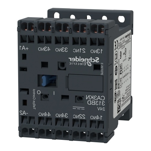 Schneider CA3KN313BD Square D TeSys Industrial Relay 24 VDC DC Standard coil Four Pole 3-NO Single Throw 1-NC Single Throw Spring Terminals relay. This relay is designed for industrial use and can be expanded to have more contacts. This relay is Din Rail or Panel mount and 690 VAC load rated.