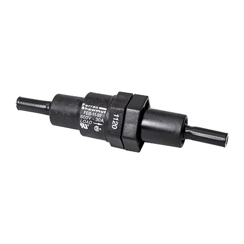 Mersen FEB-11-92 - Mersen’s complete line of single and dual pole in-line fuse holders accommodate either 1-1/2" x 13/32" (10 x 38 mm) midget or Class CC fuses. The fuse holders are designed for quick installation. Securing nuts or screws are captive thus speeding installation by reducing the need to locate and assemble loose components in the field. Three internal O-rings per pole seal the fuse holder providing a waterresistant compartment for the fuse. The captive O-rings are colored (blue for single pole and red for dual pole) for quick detection. Optional cone shaped insulator boots can be slipped on to provide a watertight seal (breakaway versions come with boots standard). Both single and dual pole versions have an optional breakaway feature which safely disconnects the load in case of a pole knockdown. Fuses remain safely encapsulated within the watertight fuse holder on the load side. Once the pole has been reinstalled the fuse holder can be easily reconnected.