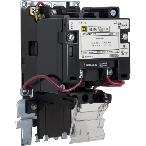 This NEMA Size 0 motor starter has single phase ratings of 1 HP at 115 VAC and 2 HP at 230 VAC