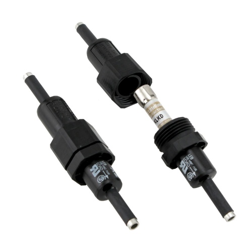 Littelfuse LEBCJ - Inline Watertight Fuse Holder- The Littelfuse 600 V in-line watertight fuse holders are the ideal answer for all high humidity and corrosive environments where fuses are required. Available in both breakaway and non-breakaway, single and double pole versions, these fuse holders allow maximum flexibility for any application. Applications:-Street, alley, and parking lot lighting-Security and perimeter lighting-Traffic signals-Outdoor illuminated signs-Sports lighting-Boat electrical circuits-Tractors and yard equipment-General outdoor circuit protection-Benefits:-Safety-Permits individual fixture or device to be disconnected from circuit for servicing. Eliminates possibility of shock.-Individual fixture fusing-Prevents loss of one fixture through accident, vandalism, or end of life from darkening the entire circuit.-Simplifies maintenance- Being able to immediately identify the one faulted fixture eliminates testing the entire circuit, speeds repair and permits servicing the individual unit while the rest of the circuit is functioning.-Reduces damage from fault-Can prevent faulted ballast or other failure from severely damaging fixture or device, reducing necessary repair or need of replacement.-Features:-Watertight-Internal O-ring provides watertight seal-Superior terminal seeds-Ultrasonically-welded terminals provide maximum strength and eliminate leaking at terminals.-Break-Resistant- Fiberglass –reinforced polymer body resists damage from dropping or impact much better than phenolic look-alikes.-Flexible terminations-Accommodates a wide range of stranded or solid copper conductors, with either crimp or screw terminals.-One-pole and two-pole models- available to accommodate all system voltages up to 600v.