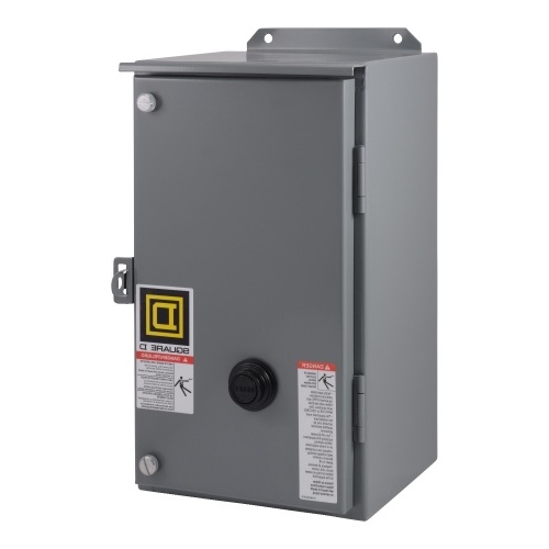 A painted sheet steel NEMA 12/3R dusttight and driptight industrial use enclosure is used to protect this starter