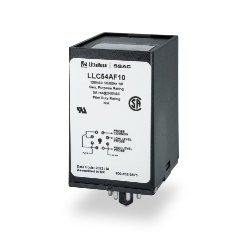 Littelfuse LLC54AF10 is a 8-pin plug-in relay with a 5 A resistive load rating at 240 Volts. It can also handle a 1/10 hp load at 240 Volts. The input AC line frequency can be 50 or 60 Hz. The debounce time delay is less than 1 s. It has a fixed sense resistance of 10 Ohms and sense voltage is pulsed DC. It uses resistance sensing to detect high and low levels of conductive liquids. Sense resistance tolerance is ±10% or 500 Ω, whichever is greater.