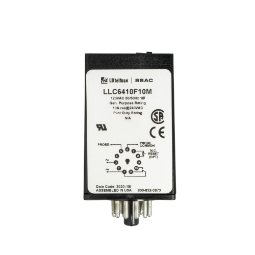 Littelfuse LLC6410F10M is an 11-pin relay type product with an output load rating of 10 A resistive @ 240 Volts, 1/4 hp @ 125 Volts, and 1/2 hp @ 250 Volts. It supports an input AC line frequency of 50 / 60 Hz with -0.3% tolerance, and offers surge protection to IEEE C62.41-1991 Level A standards. With a control type of ON/OFF (single level) resistance sensor and a built-in time delay to prevent rapid cycling, it ensures reliable operation. The product additionally features a humidity resistance of 95% non-condensing and a reset time of manual or automatic.