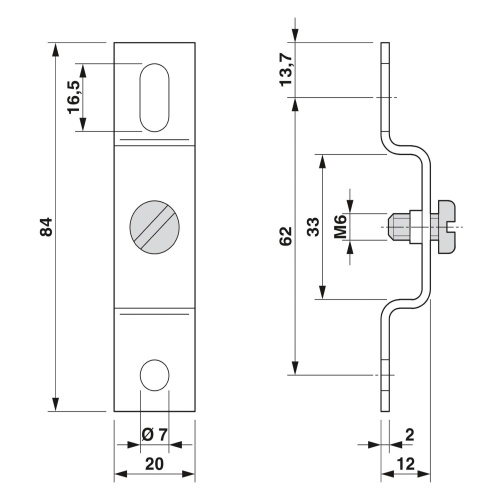 Phoenix Contact 1201060 A flat bracket featuring an M6 screw is designed to securely attach to DIN rails that are installed 12 millimeters above the mounting surface.