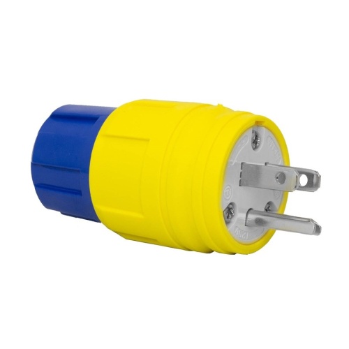 Ericson Yellow Extreme Grade Watertight Plug (Sku: 1510-PW6P) is ideal for environments requiring a watertight seal to prevent water ingress. With a Phase 1 rating, it is suitable for various applications such as construction sites and entertainment venues. Designed for a Washdown procedure, it has a NEMA 5-15 configuration, 2P/3W poles/wires, and operates at 125V and 15 Amps. CSA certified and NSF/ANSI/3-A 14159-1 compliant. Case Qty: 100, Carton Qty: 10.