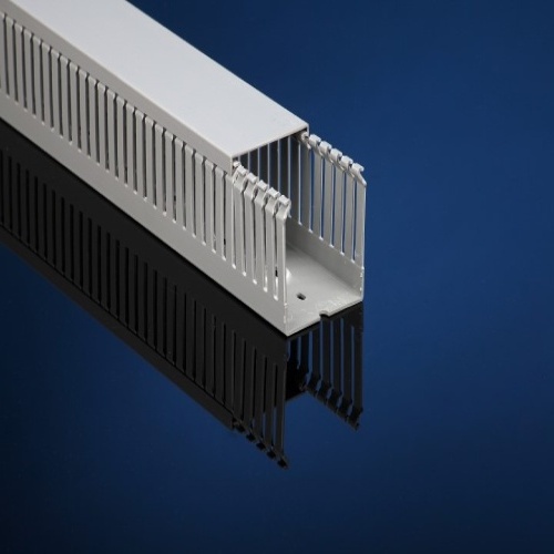 Iboco T1E2240G Gray Wire Duct 6' Length with Cover (2 1/4" wide X 4" deep),6' lengths. Made of rigid PVC with a UL 94V-0 flammability rating. Flush cover designed to hold 10% more wires. Standard mounting holes and wide finger design make it more rigid and larger slot width.