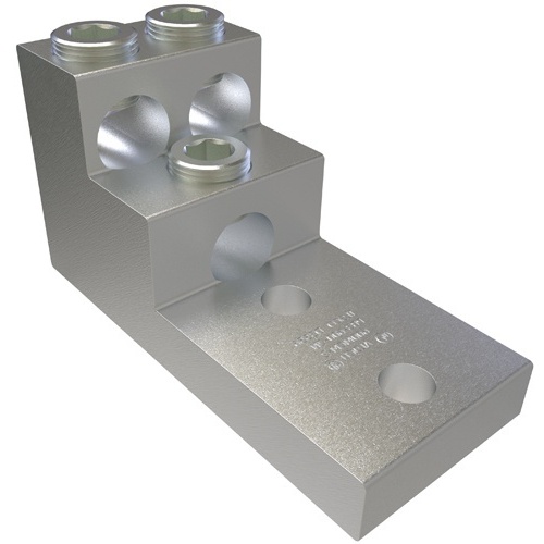 Ilsco PB3-600-2N - Aluminum Panelboard Lug, Dual Rated for conductor range 600-2, 3 ports, 2 holes, 1/2in bolt size, UL/CSA listed. Tin plated with copper conductor material. Suitable for 35kV voltage rating. Mounting hole spacing 1.75in, with internal hex drive and wire binding torque of 500. Designed for perpendicular wire orientation.