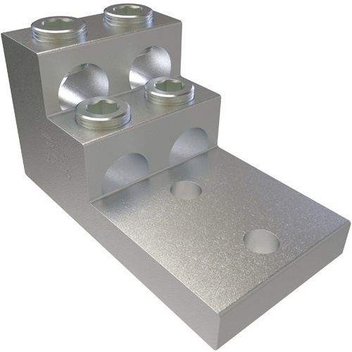 Ilsco PB4-750-2N - Aluminum Panelboard Lug, Dual Rated for 750-1/0 conductors, UL & CSA listed, 4 ports, 2 holes with 1/2in bolt size. Tin plated, 1-3/4in hole spacing. Suitable for 35kV, 90°C. Mechanical connection for copper & aluminum stranded conductors. CSA standard C22.2 No. 65-03. Ideal for Form 1 applications.