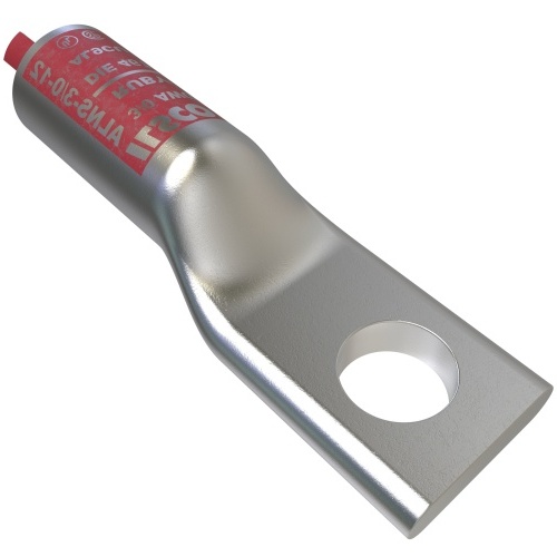Ilsco ALNS-3/0-12 - Surecrimp Aluminum Compression Lug for 3/0 Stranded Aluminum Conductors. 1-hole design with 1/2in Bolt Size. Long barrel with Tin Plating. UL, CSA, NEMA listed. 35 kV voltage rating, 90°C temperature rating. DE-OX® included. Tang dimensions of 1.25" length, 1.044" width, and 0.266" thickness. 180° connecting angle. Compact size with expansion range from 3/0 Str to 1 Str.