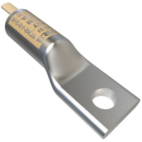 Ilsco ALNS-1/0-516 - Surecrimp Aluminum Compression Lug for 1/0 conductor size, 5/16in bolt size. Long barrel with tin plating and dual UL/CSA rating. Suitable for 35kV with compression connection. Tang dimensions: 0.214in thick, 0.819in wide, 0.9in long. No sight window, contains DE-OX®. Mounting hole diameter: 8.7122mm. Compatible with 1/0 Str - 1 Str conductors.